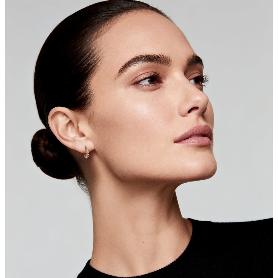 The unique double-hoop design, linked by a delicate gold chain, offers endless styling possibilities — especially the right earring, which can be worn creatively across two piercings for a layered, modern edge. Each detail reflects a radiant confidence that moves gracefully with you.