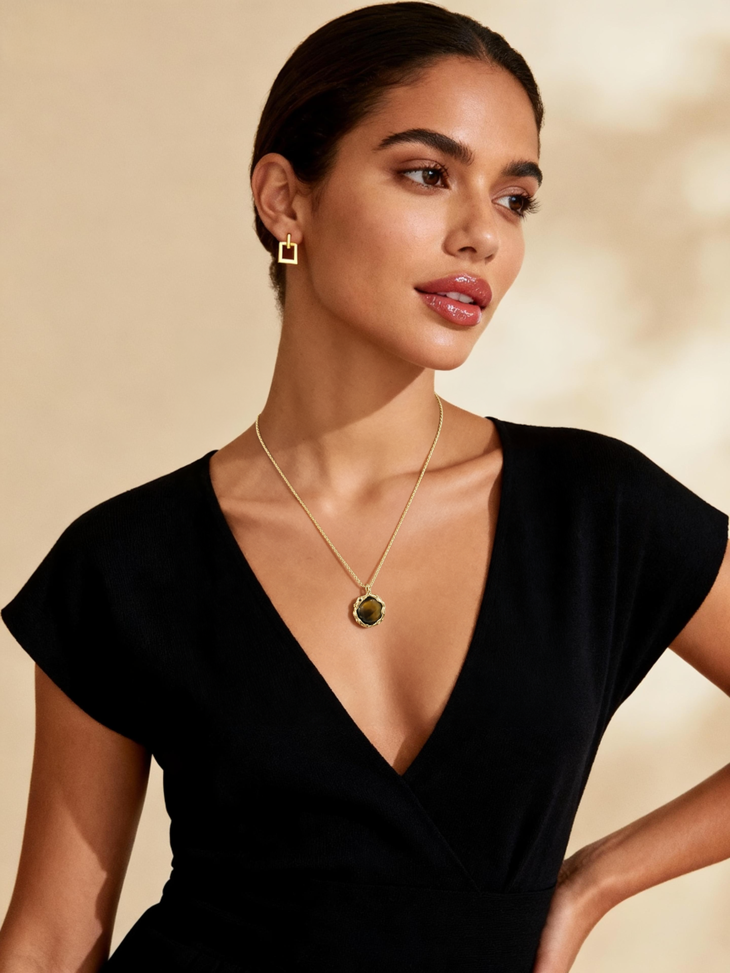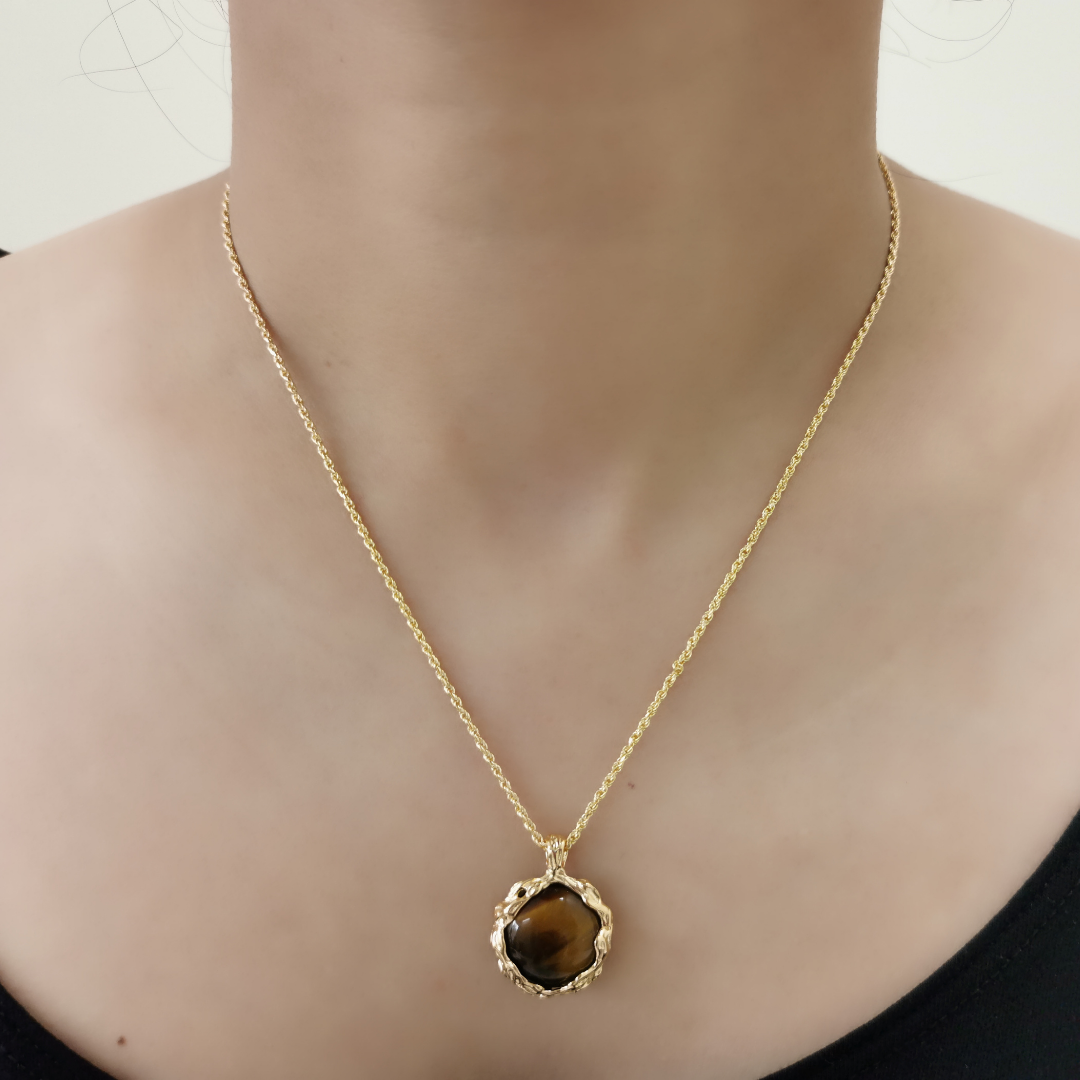 Ploutos Jewellery 18K gold-plated tiger’s eye pendant necklace — elegant handcrafted design on fine gold chain, minimalist luxury style.