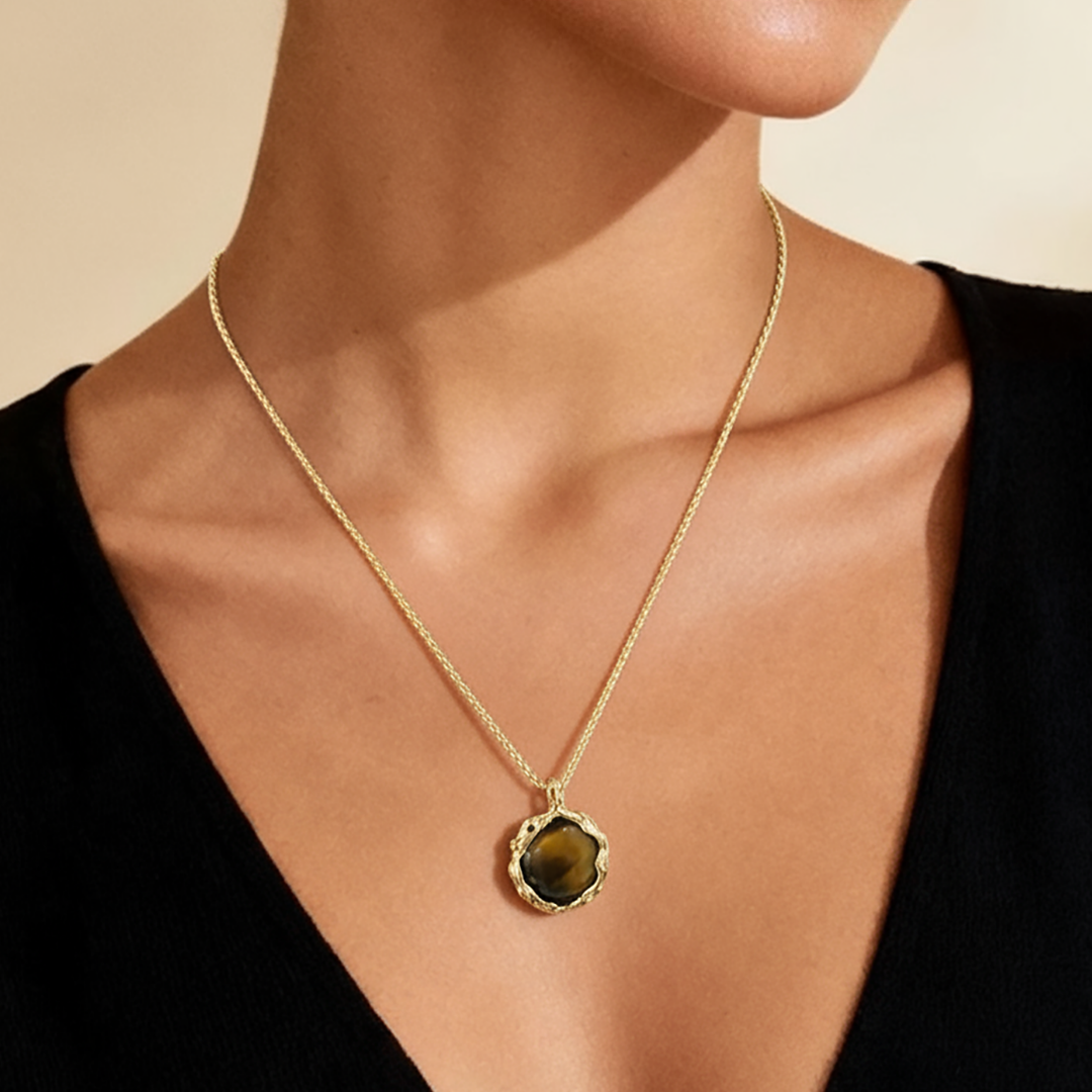 Hand-carved with volcanic texture and framed in 18K vintage gold plating on 925 sterling silver, the Celestial Ember Necklace captures the grounding power of Tiger’s Eye — a stone of strength, clarity, and protection.