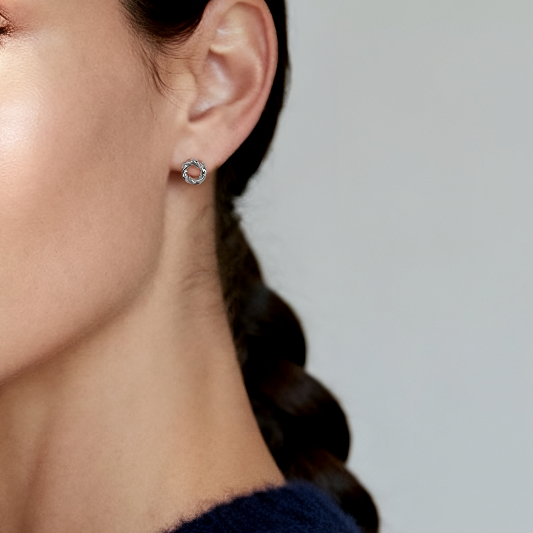 Ploutos Jewellery Harmony Loop Stud Earrings in 925 sterling silver — twisted circular silver studs from the Abundance Collection, symbolising unity, balance, and timeless elegance.