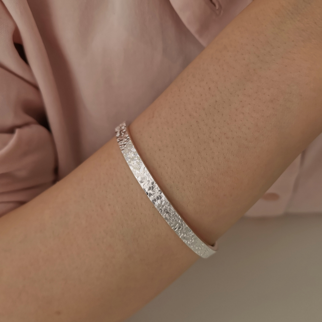 Crafted from 999 fine silver, its open-ended design ensures both comfort and style, while the subtle hammered texture reflects light with a natural, fluid brilliance.
